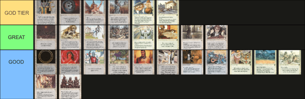 While The Dark may be perceived as an overall weaker expansion in terms of power level, it still offers gems among its White cards that showcase the color’s enduring strength. Preacher, with its ability to commandeer enemy creatures to fight on the side of righteousness, exemplifies White’s capacity for strategic manipulation and control. Similarly, Dust to Dust provides a potent answer to the proliferation of artifacts, showcasing White’s ability to cleanse the battlefield of opposing threats. Despite the challenges posed by The Dark’s darker themes and diminished power level, these standout White cards serve as shining examples of the resilience and adaptability that define the color’s essence.