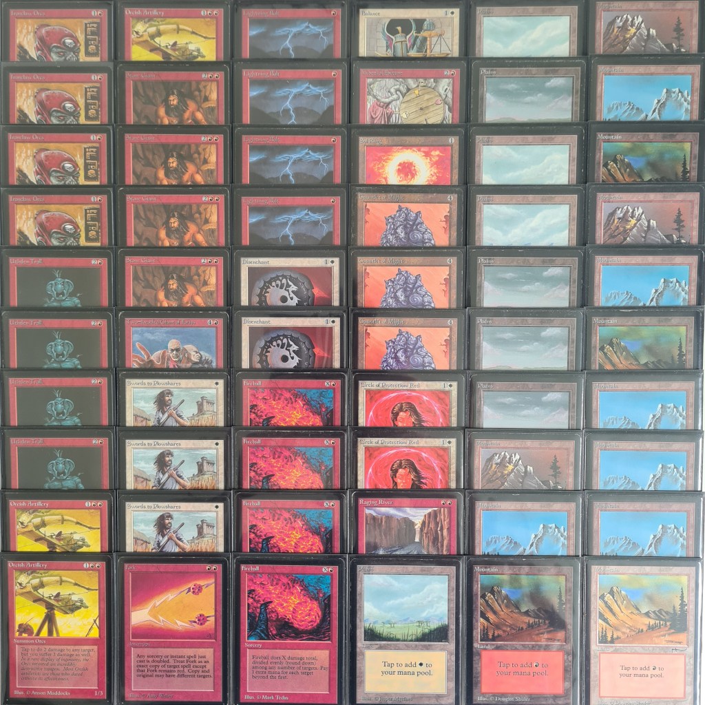 The goal for this deck was to make Gauntlet of Might the central piece, so I decided to pivot dramatically from my original idea. Instead of tweaking what wasn’t working, I opted to build a mono-red deck. While a Kobold deck seemed like the obvious choice for utilizing Gauntlet of Might, I found Kobold decks quickly become monotonous. There’s little interaction beyond flooding the board with creatures and attacking, which loses its appeal after a couple of weeks. I needed a more engaging mono-red deck, so I turned to another childhood favorite: Ball Lightning. Since Ball Lightning fits perfectly in mono-red, it seemed like a natural fit. I wanted to make the best mono-red deck with Balls of Lightning possible. My mind immediately thought of the infamous Sligh deck. Although the Sligh deck is often considered the pinnacle of mono-red strategies, it doesn’t align well with the 93/94 card pool. After some goldfishing on Sligh in Old School, I came across a blog post from Magnus, who aimed to adapt the core concept of playing efficiently on the curve into an Old School framework using software he wrote based on the Nash equilibrium. Why? I don’t know; he’s just a crazy mf-er with too much time on his hands, I guess. Anyway, he came up with a cool deck and I swapped a few filler cards for my three copies of Gauntlet of Might. The result was the following (all black bordered) deck: