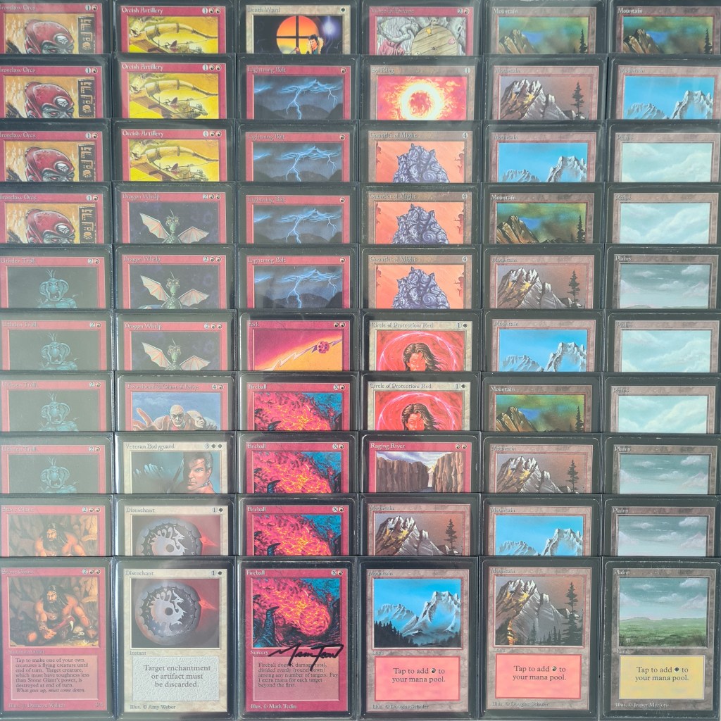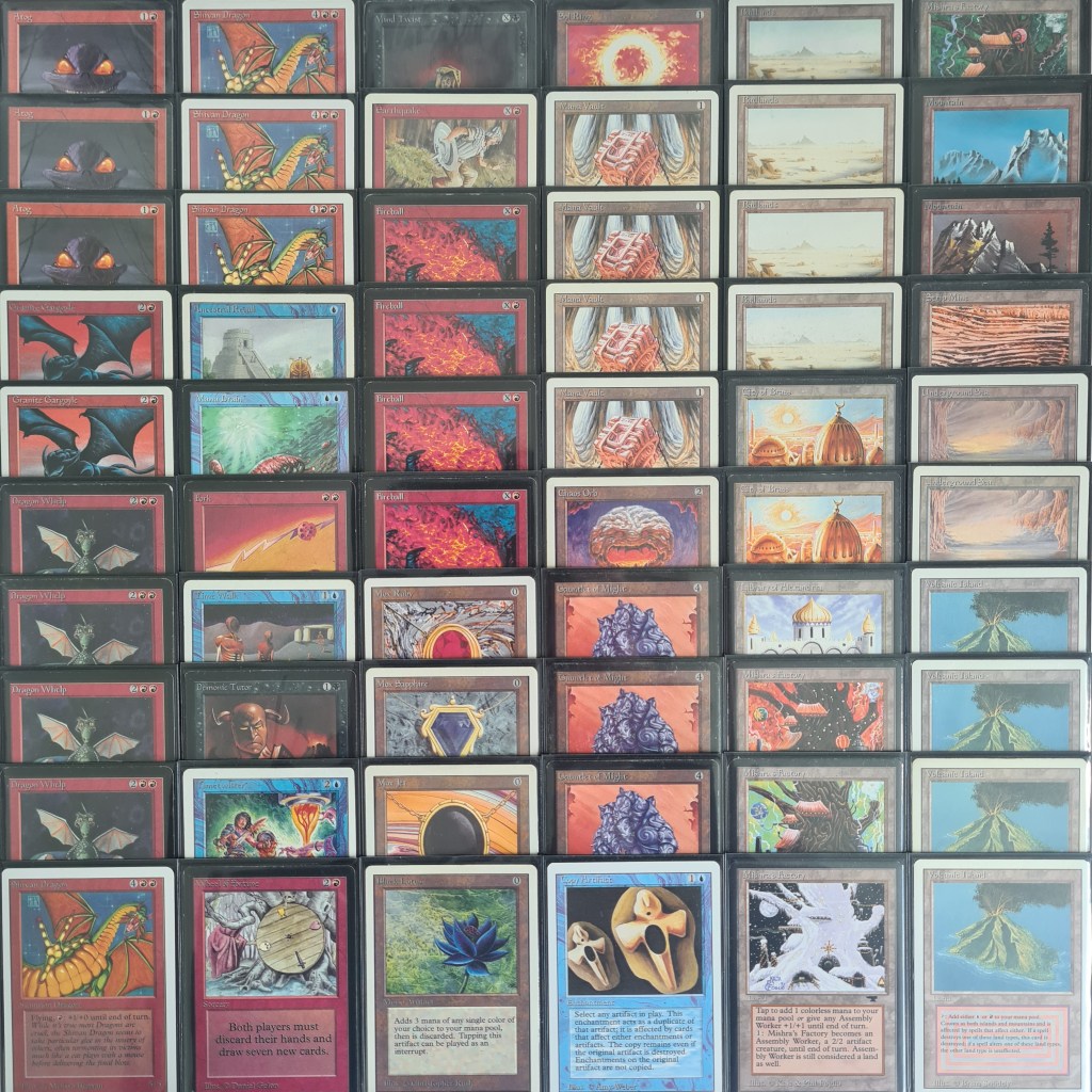 Initially, my plan was to recreate the deck exactly as I envisioned it back in 1995. I used to play a black and red deck focused on getting Shivan Dragons out quickly with spells like Dark Ritual. In my teenage mind, the Gauntlet of Might was the perfect card to enhance this strategy, making my dragons faster and stronger by leveraging the Gauntlet’s dual abilities: accelerating my mana and boosting the dragons. If I had the cards back then, I would also have loved to add the blue power cards, along with the Moxen and Black Lotus. My dream deck from those days might have looked something like this, although it’s been a long time, and my recollection isn’t perfect.