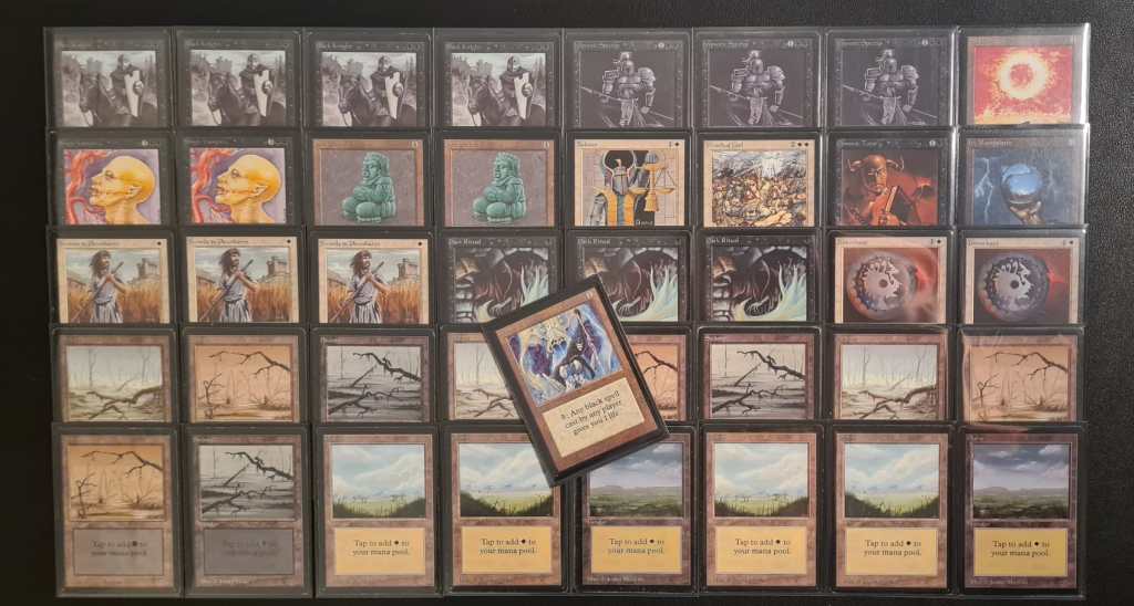In the end, I decided to play Deadguy Ale, featuring iconic cards like Hypnotic Specter, Dark Ritual, and Swords to Plowshares. Under Alpha 40 rules, protection from color cards function as originally intended, meaning they simply can’t be affected by spells of the corresponding color. This made my Black Knights absolute beasts when combined with Wrath of God and Balance. Plus, when else would I have the chance to play a Beta Wrath of God?! I had to seize the opportunity! With two sweepers in my library, Jade Statue also became a strong option; its six toughness made it a real powerhouse.